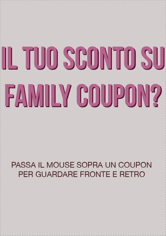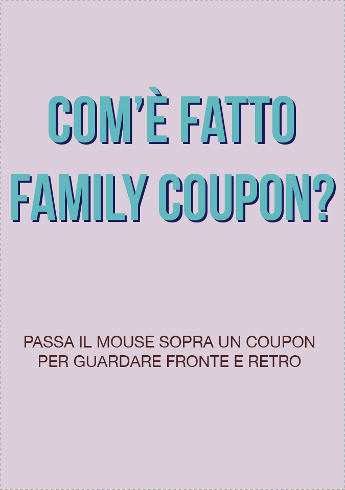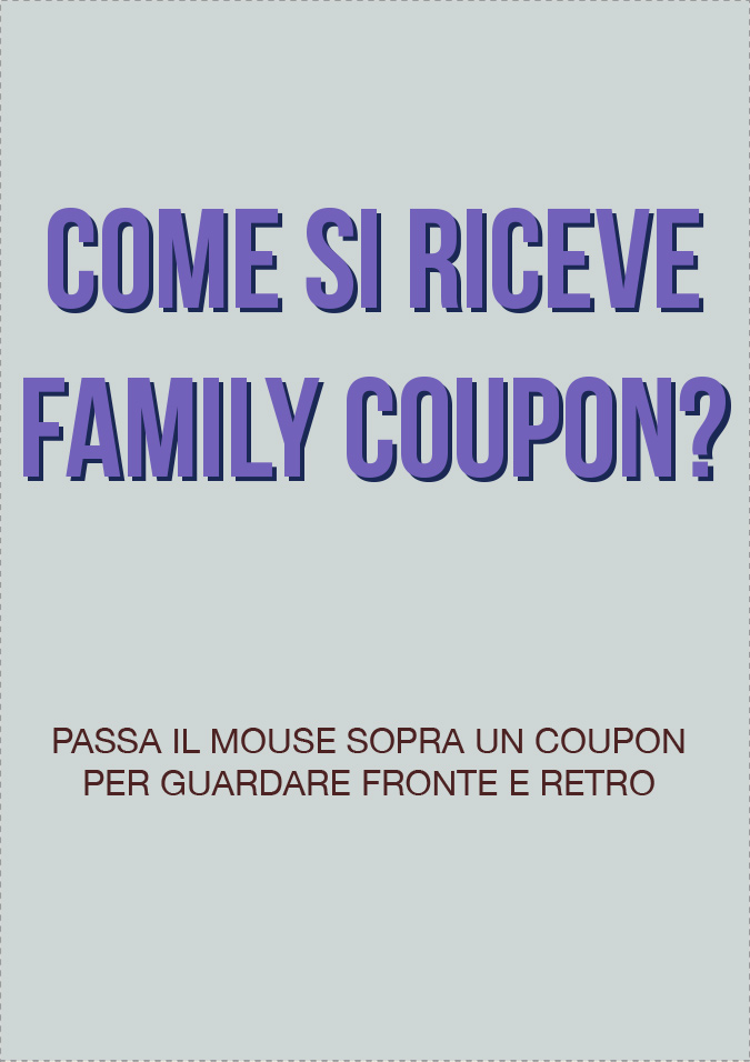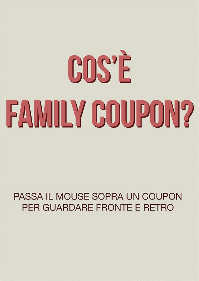 Il carnet Family Coupon contiene solo buoni sconto/coupon ed è stampato in formato carnet album di cm 14x9 per facilitarne l’inserimento in cassetta postale.
